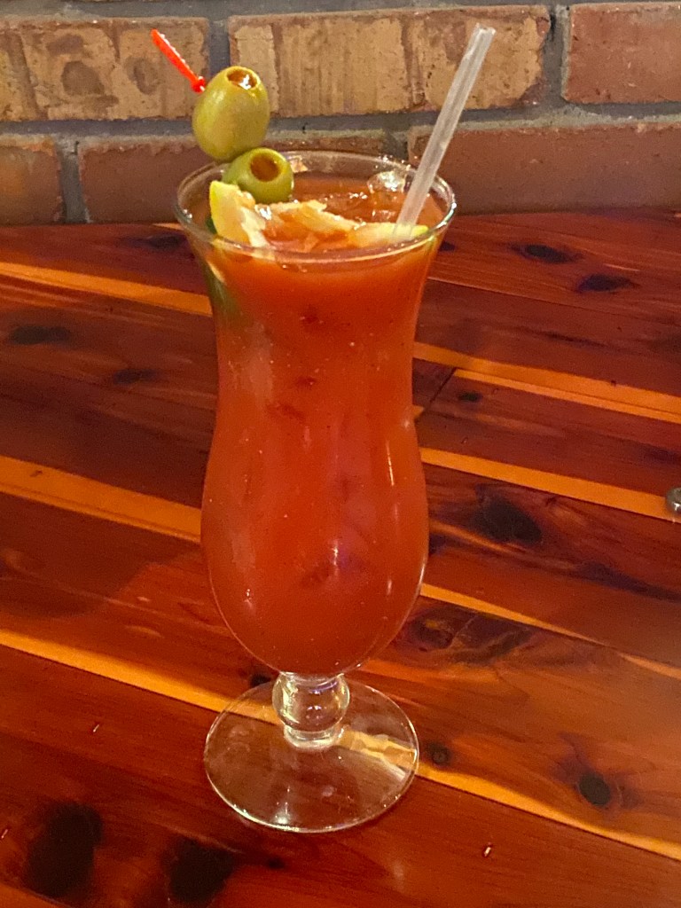 They serve it in a cute Bloody Mary glass with lemon, lime & olives for garnish and it tasted good… not great. Our server didn’t ask if I wanted it spicy 🌶 sooo it came pretty plain but they brought me the Tabasco… better but again still just so so.